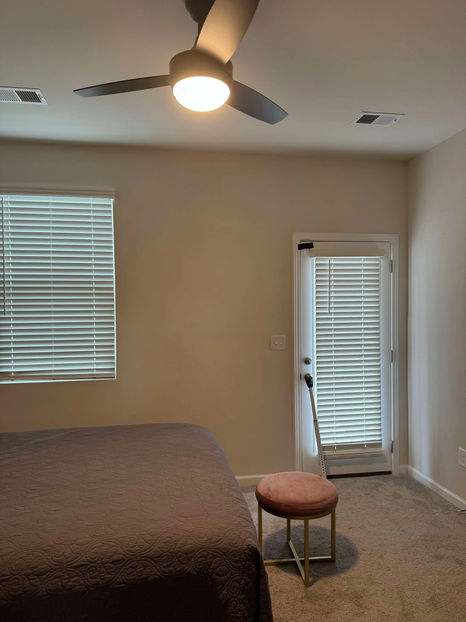 Guest bedroom on lower level of townhome in Charlotte, NC. Located in West Charlotte, 10 minutes away from the Charlotte Douglas International Airport. This bedroom is fully furnished with a computer desk, mini fridge and tv (Amazon Fire stick), private bathroom and private back door with entry to own patio space. Quiet new construction community, 15 minutes away from Uptown.